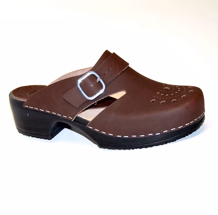 Anna brun ranch träsko med justerbart spänne på vristen & perforering på tån. Tyst & lätt mjuktoffel med Pu-yttersula. Ovandel i äkta läder med skyddande ytskikt av Pu-nubuck. Finns i storlekar 36-42.