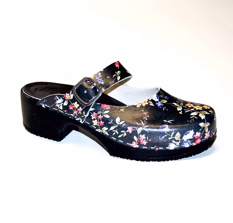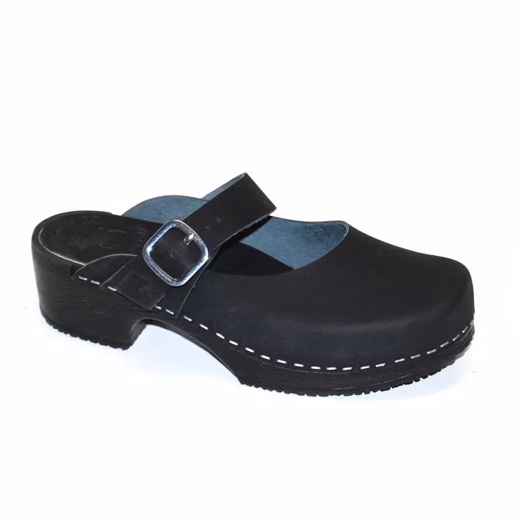 Linda svart ranch träskosandal. Tyst och lätt mjuktoffel med Pu-yttersula. Ovandel i äkta läder med skyddande ytskikt av Pu-nubuck. Finns i storlekar 36-42 .